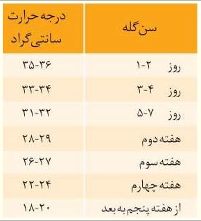 جدول ۱- درجه حرارت مورد نیاز درسطح پرندگان با توجه به سن آنها